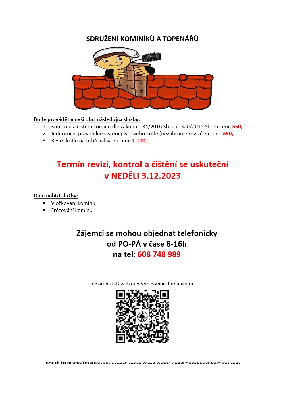 V neděli 3.12.2023 budou v naší obci kominíci. Jejich služby si můžete objednat na tel. č. 608748989