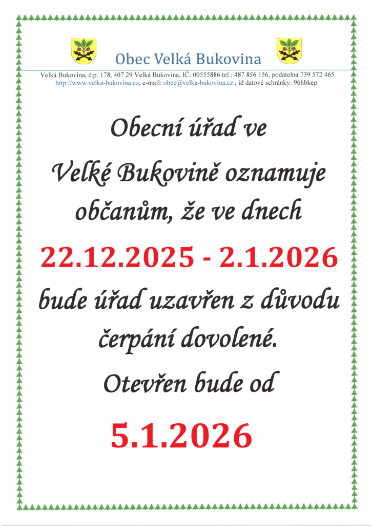 22.12.2025 - 2.1.2026 ZAVŘENO