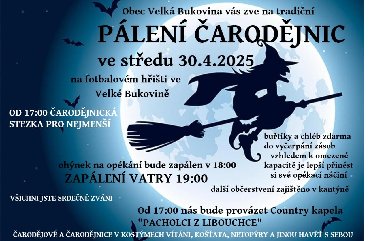 srdečně vás zveme ve středu 30.dubna na tradiční pálení čarodějnic. Na fotbalovém hřišti ve Velké Bukovině od 17:00